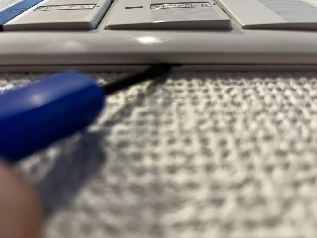 下部に凹みがあるのでマイナスドライバーなどの細いものを挿して隙間を作ります。指を引っ掛けても取れます。