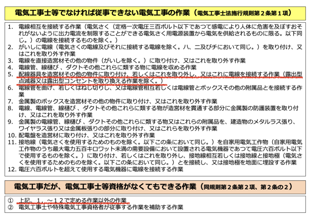 電気工事士法施工規則第2条第1項の赤線部分によると、電線が接続されていないハンドルやプレートは電気工事の対象外と解釈できます。