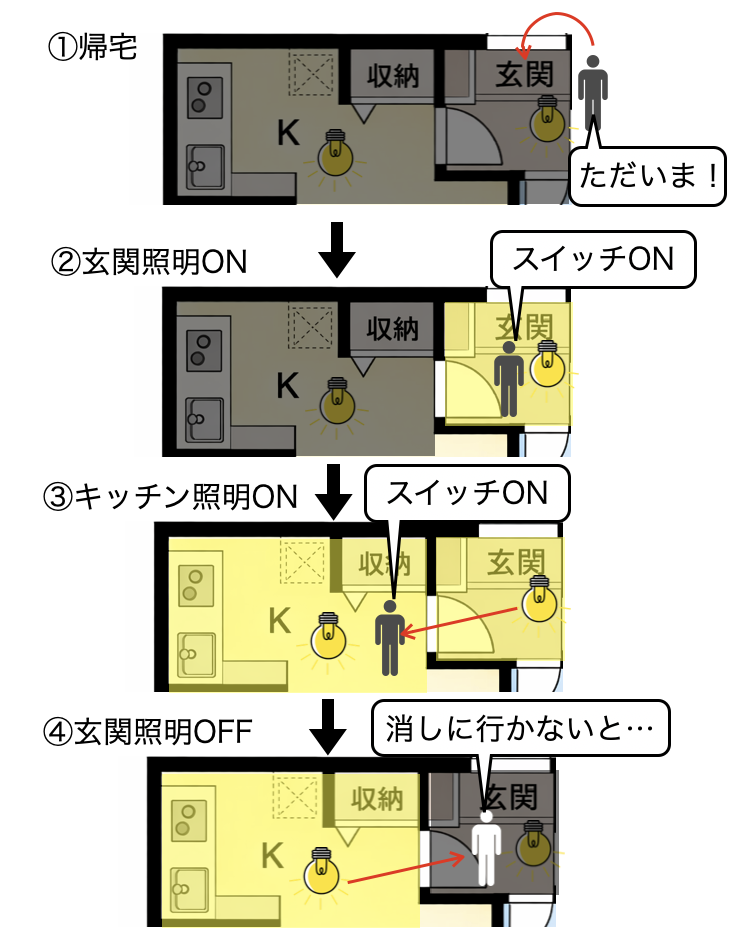 玄関の照明をつけたままキッチンまで移動し、そこでキッチンの照明をつける必要があります。